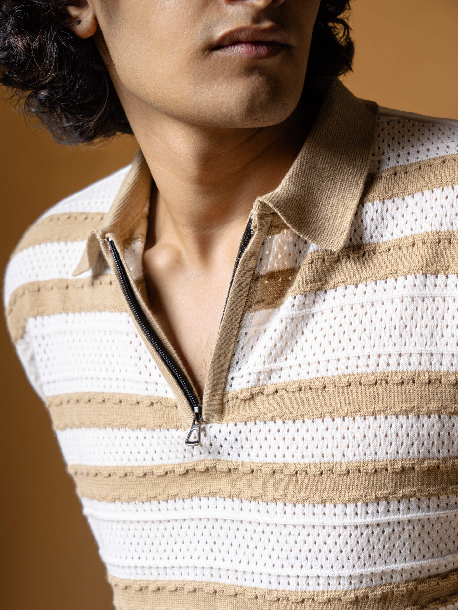 WavyCouture Brown Stripped Chain Collor Polo T Shirt